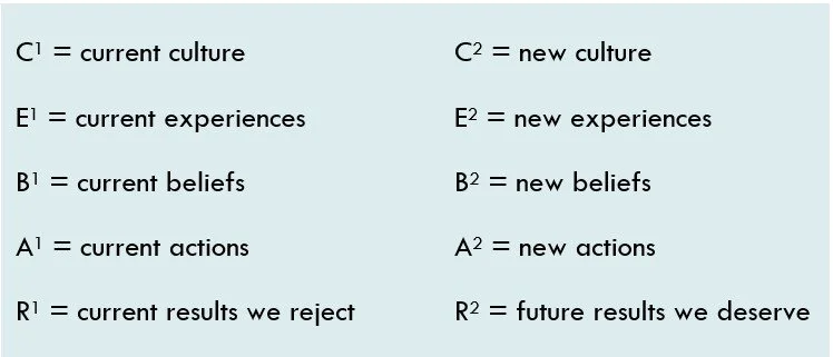 What are some elements of C1 we want to keep? What are some new experiences we can create through actions that form beliefs to realize R2? Just like you did for your R1’s, you can create a table that lists the elements of the Culture in 2 columns, Current and Future, to be able to see how you can go ‘from this to that’ in a nice visual. It will also help you gauge the size of the delta from C1 to C2.